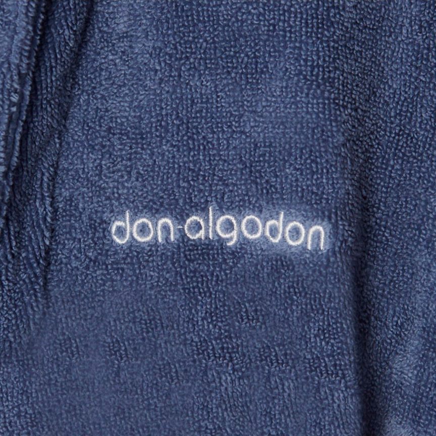 Albornoz de adulto 100% algodón Zero Twist en color azul, de la marca Don Algodón. Muy resistente al lavado, de tacto extra suave, esponjoso y muy agradable, con alto poder absorbente. Albornoz de 420 gramos sin torsión, bordado con el logo de Don Algodón en Jacquard.