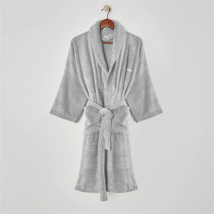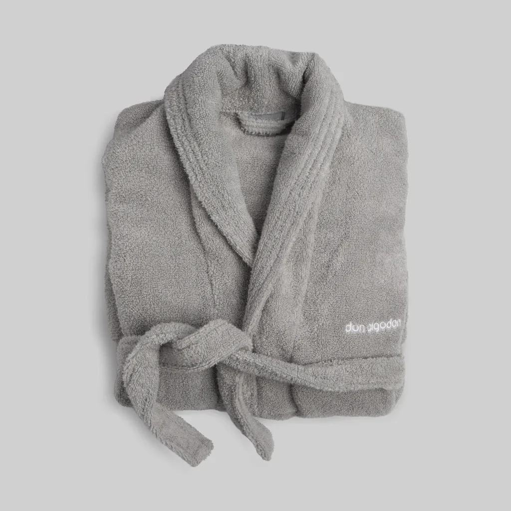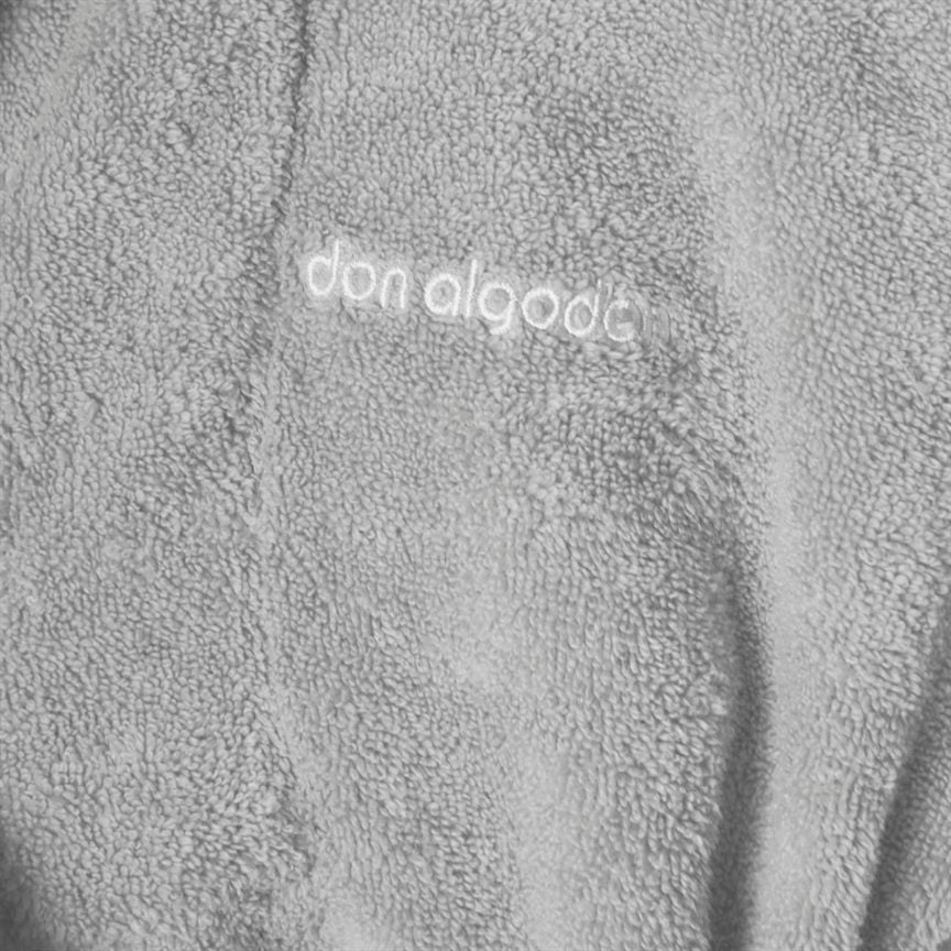 Albornoz de adulto 100% algodón Zero Twist en color niebla, de la marca Don Algodón. Muy resistente al lavado, de tacto extra suave, esponjoso y muy agradable, con alto poder absorbente. Albornoz de 420 gramos sin torsión, bordado con el logo de Don Algodón en Jacquard. Ligereza, confort y elegancia con un altísimo poder de absorción.