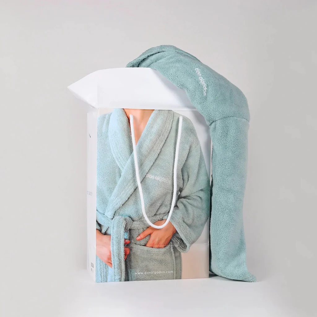 PRESENTACIÓN: el albornoz se presenta doblado dentro de un envase de PVC con cremallera y asas para transportar.