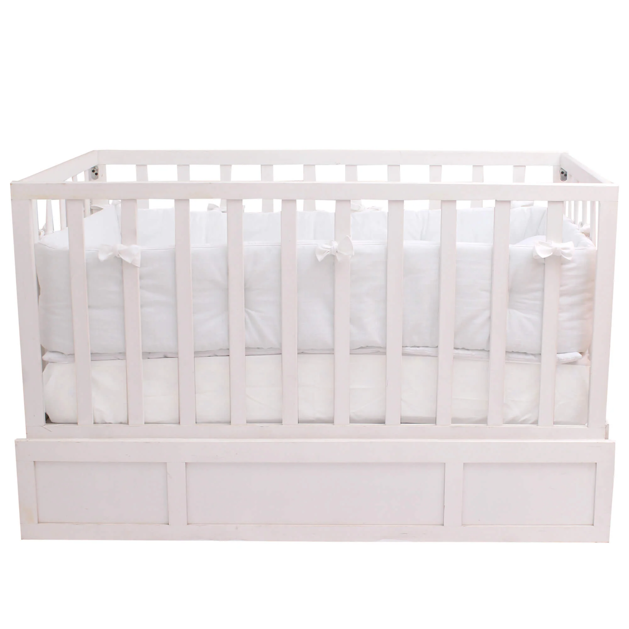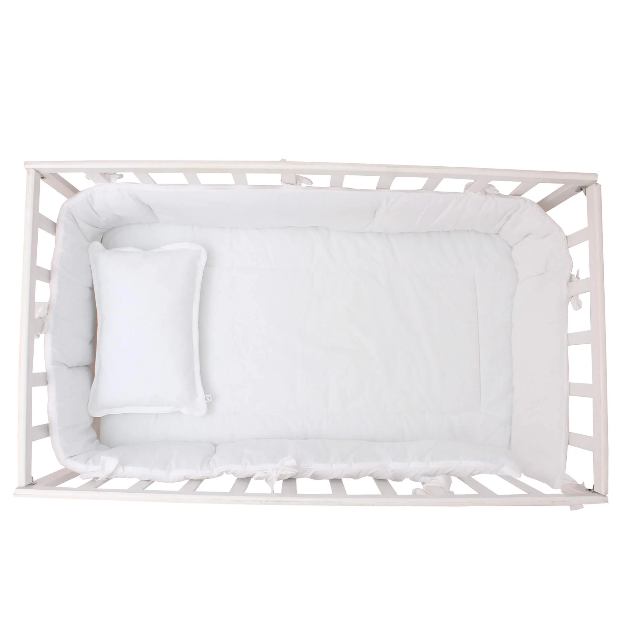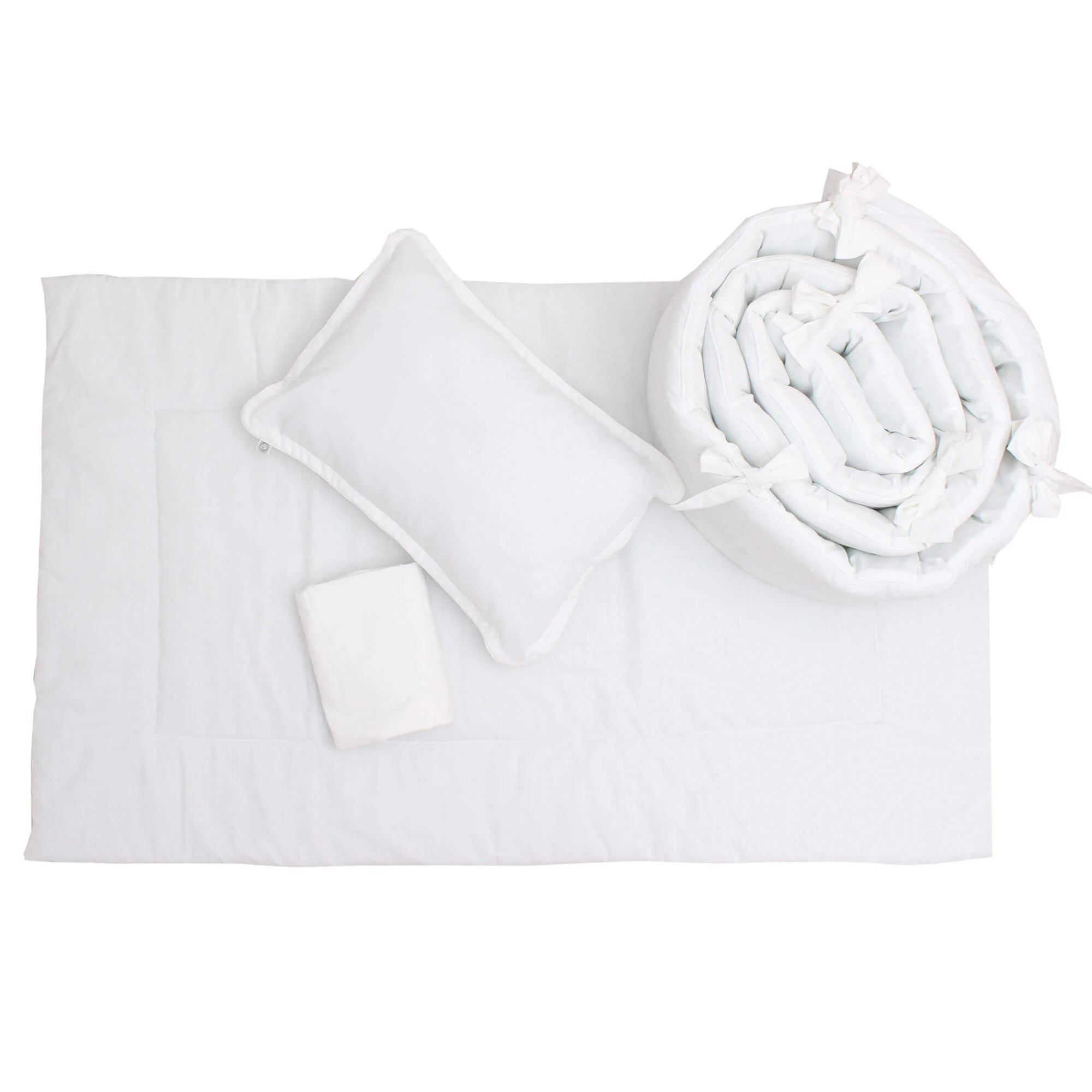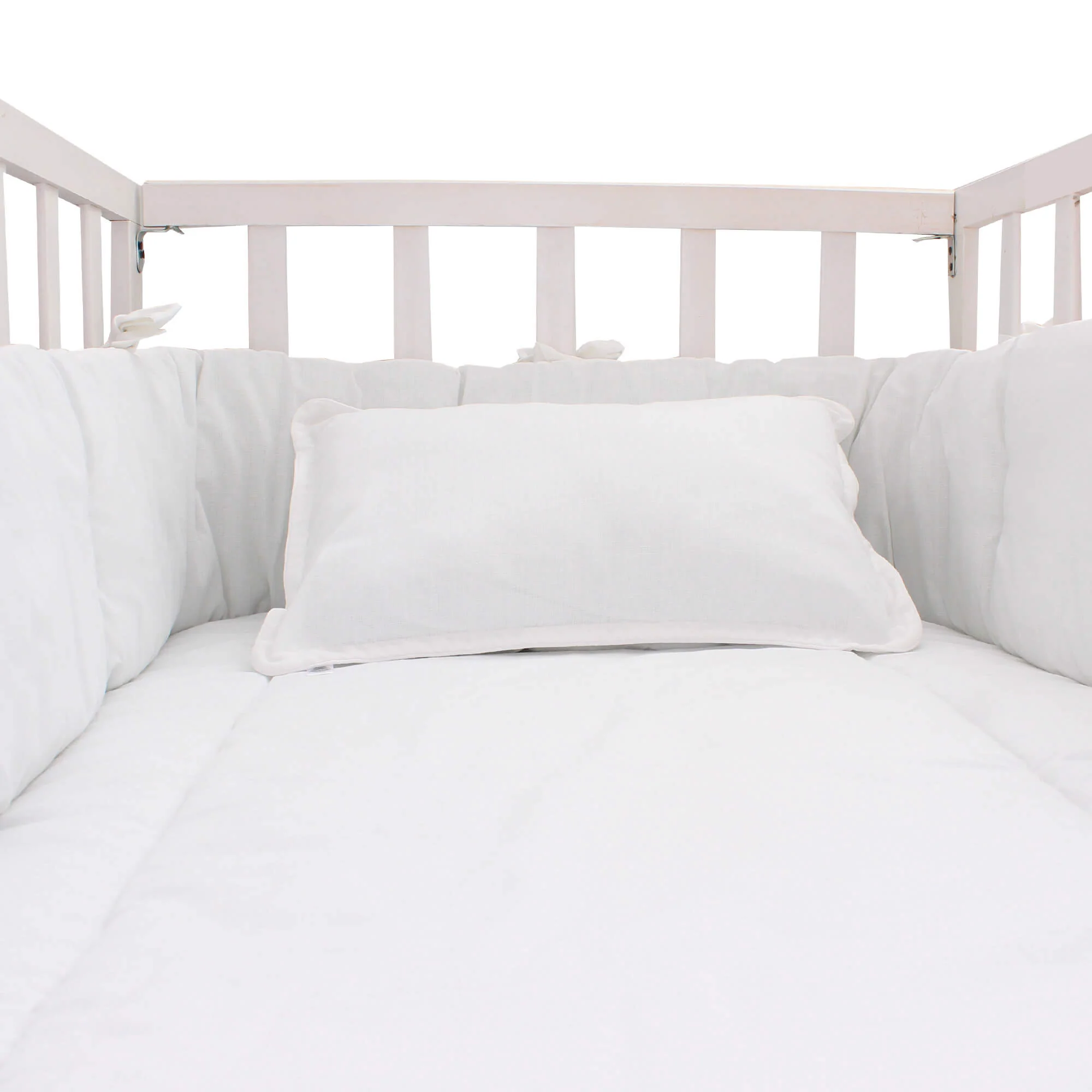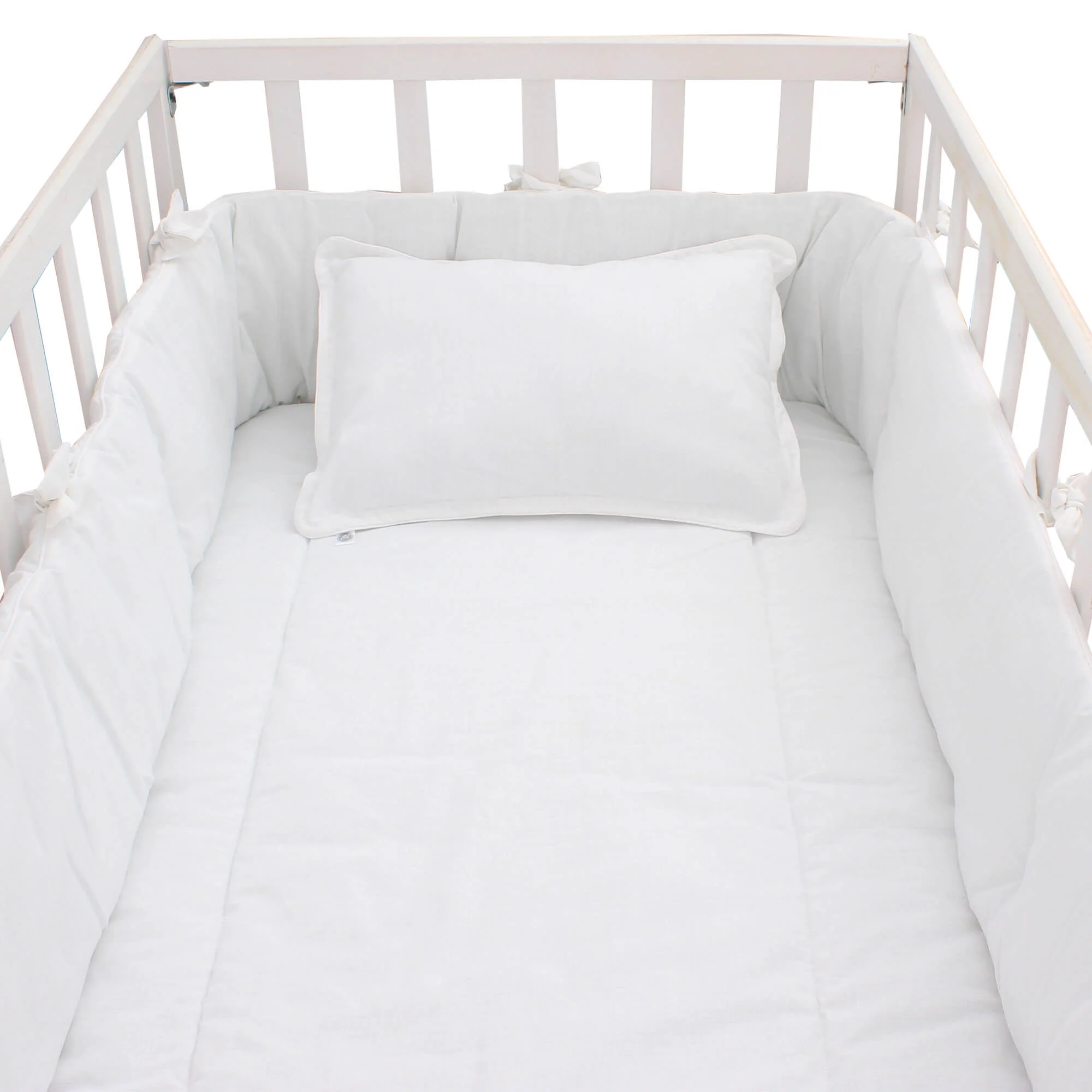 Dale a tu bebé un descanso placentero con este set 100% algodón, estilo neutro en blanco y tela tipo lino. Incluye edredón ligero, bumper completo con sujetadores ajustables, sábana de cajón lisa y cojín tejido. Tela de trama abierta súper suave que armoniza la habitación y mantiene a tu bebé fresco y cómodo.