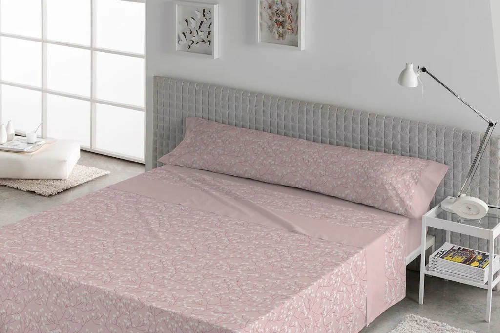 Juego de cama de 3 piezas para verano que incluye sábana encimera con un elegante y sutil estampado floral, bajera ajustable en color rosa palo y funda de almohada con el mismo estampado que la encimera.