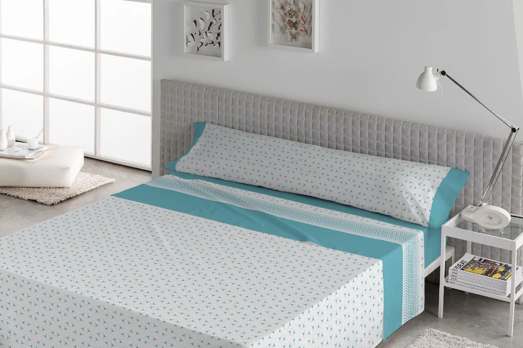 Juego de cama de 3 piezas para verano que incluye sábana encimera con un moderno estampado de formas geométricas, bajera ajustable en color agua marina y funda de almohada con el mismo estampado que la encimera.