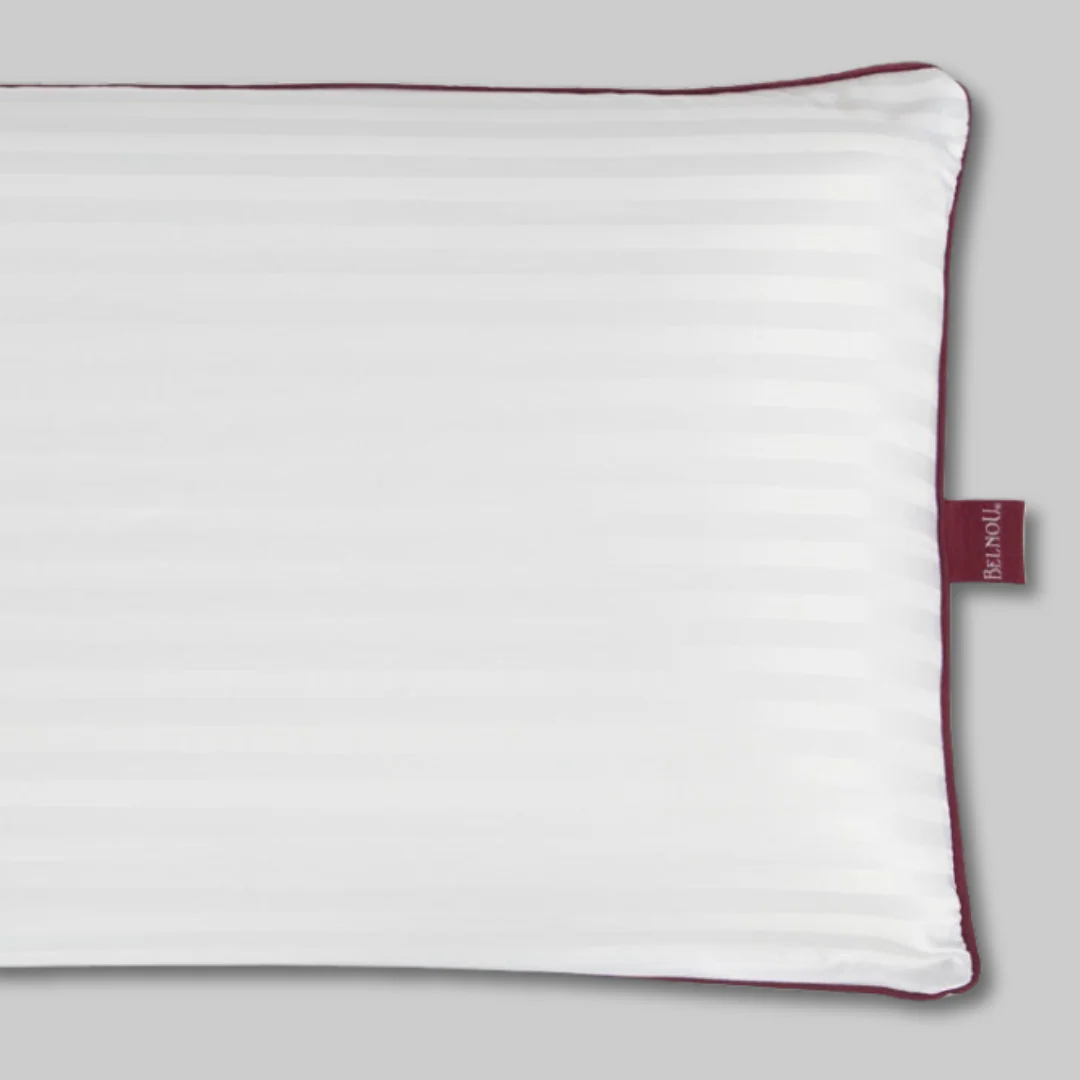 Almohada viscoseda de la marca Belnou, adaptable de tacto seda muy suave, con funda de microfibra en satén y ribetes granates. Funda interior de algodón que protege el núcleo viscoelástico, alta adaptabilidad y firmeza
